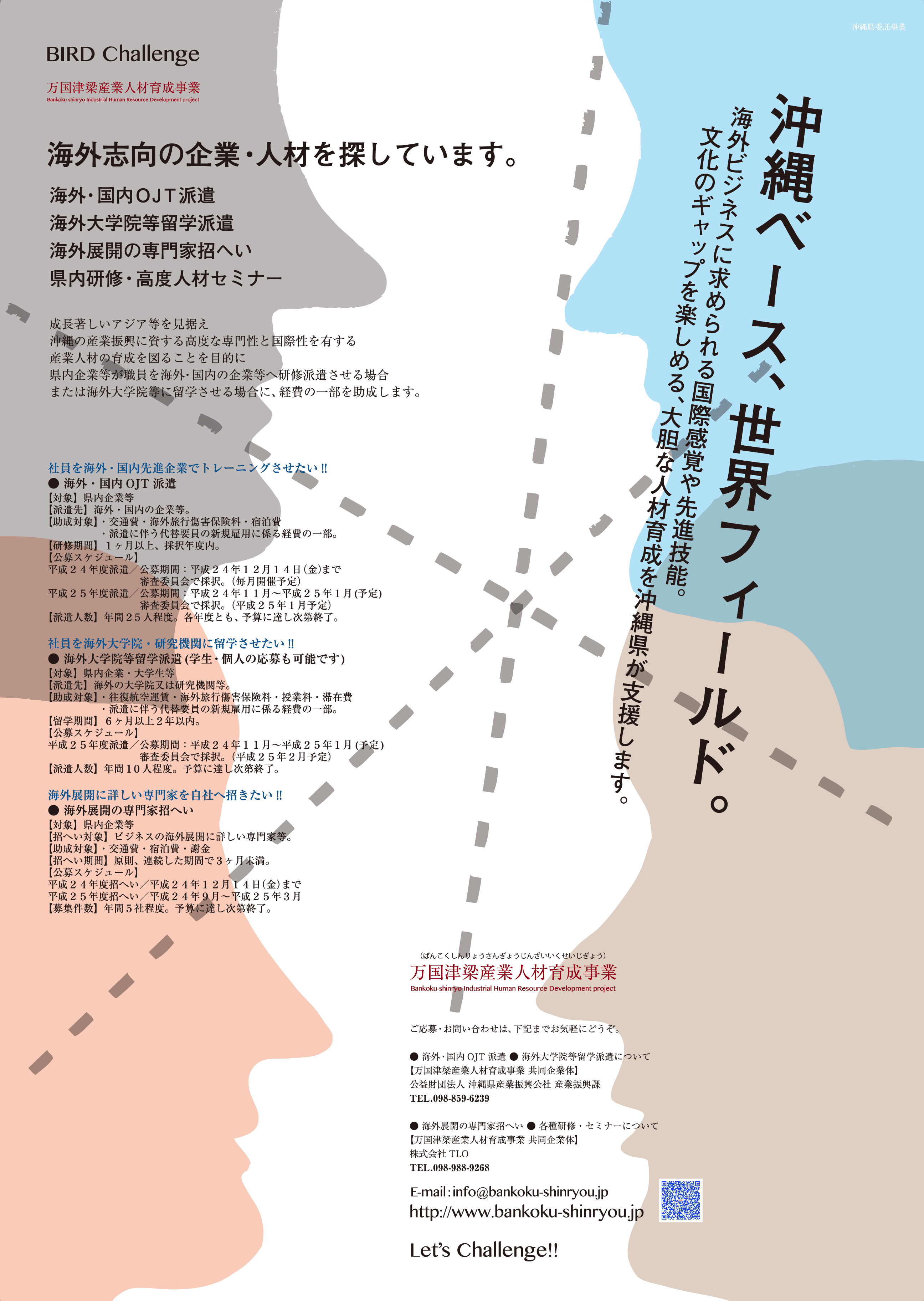 沖縄県の海外ビジネス人材育成事業のロゴデザイン、ポスター・フライヤー、WEBデザインを担当させていただきました。本事業を活用して海外ビジネスへの足がかりを掴んだ企業や社会人、学生が多数輩出され、現在も事業が推進されています。